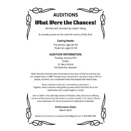 January 18, 2026 by Margaret Leatherman What Were the Chances! Audition Notice Like this:Like Loading...